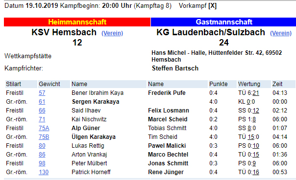 Beim letztendlich hohen 24:12 Sieg unseres Oberliga-Teams, sicherte Marcel Scheid (71kg/gr.-röm.) nach einer Top-Leistung vorzeitig den Mannschaftserfolg der KG beim Nachbarn Hemsbach. Im beiliegenden Kampfstenogramm könnt ihr den Ausgang der Kämpfe verfolgen.